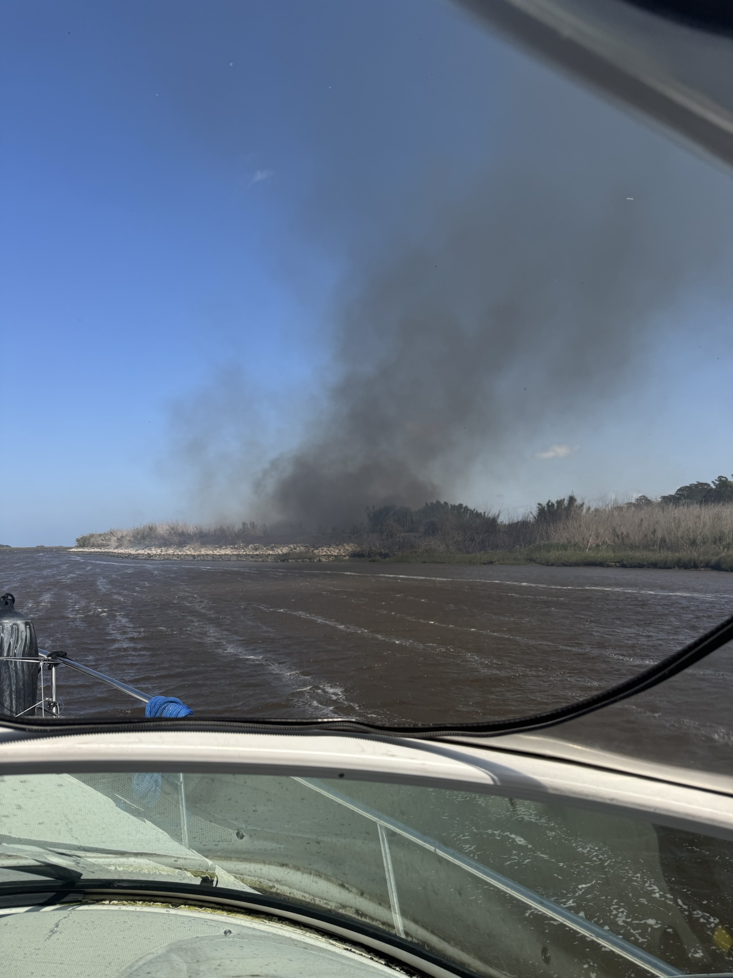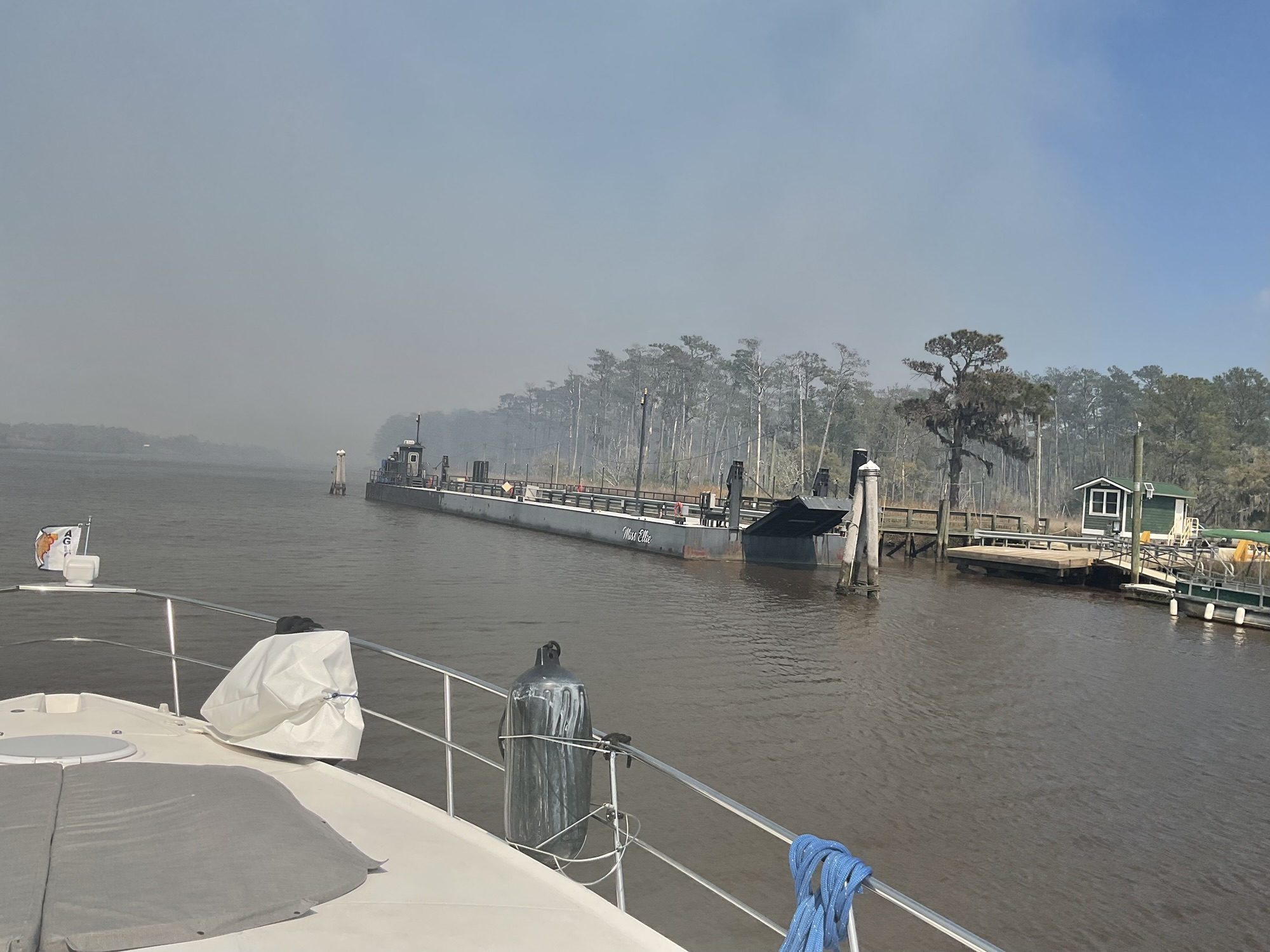 We were seeing smoke along the way in a few different areas that looked like controlled burns. It was very windy at this time, so that surprised me. Towards the end of the Minim Creek Canal where it dumps into Winyah Bay, there was a large fire right on the edge of the shore. The smoke was awful and visability was not the best. We got through it pretty quickly.