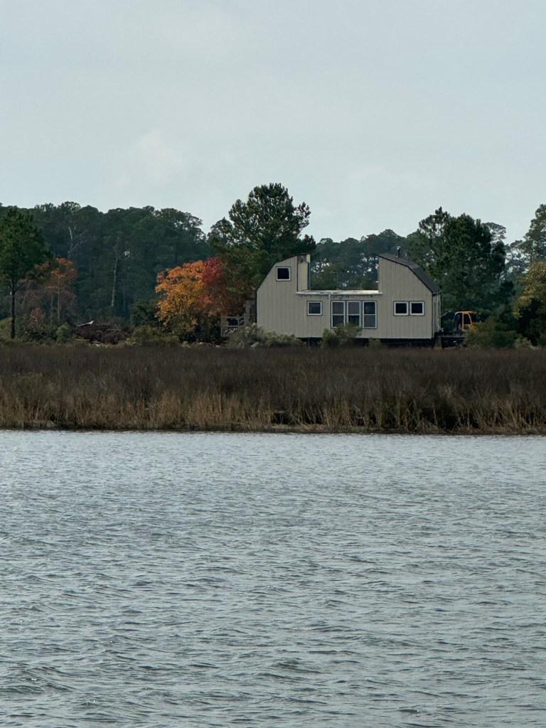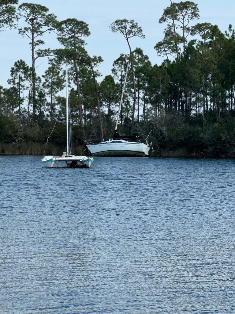 It’s so nice to see dolphins everyday again! We cruised slow today soaking in the scenery of the GICW (Gulf Intracoastal Waterway). Houses along here are mostly on stilts due to storm surge. We stopped at Lulu’s for lunch in Gulf Shores before heading to our anchorage for the next two days. Jeff and I worked on the next piece of isinglass which is very hard to sew on being 52x 82😳. The wind has already started to pick up and it will be blustery until Tuesday morning. We are tucked away in a very protected spot. They have freeze warnings down here! Brrrrr!