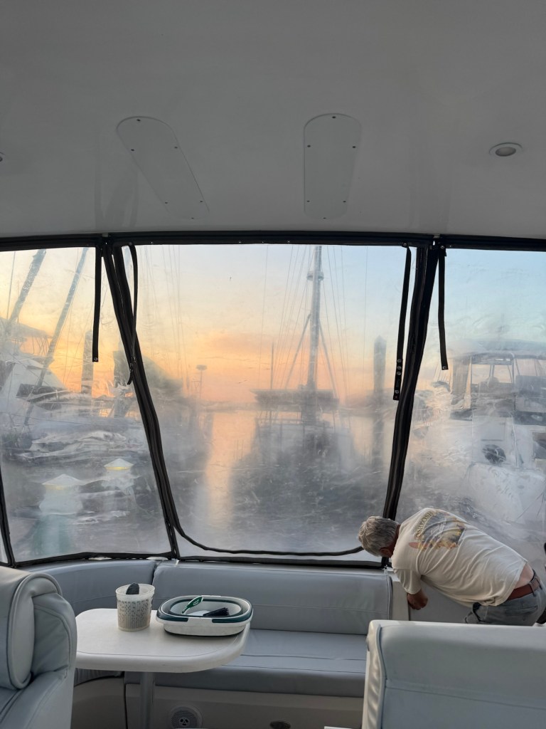 This morning was all about laundry—glorious, everything-at-once laundry! With so many washers open, I felt like I’d won some kind of domestic lottery. While I was conquering Mount Washmore, Jeff was busy swapping out fuel filters and crankcase filters like a pro. He even squeezed in a visit with the fiberglass guy, who’ll be repairing the port side of our swim platform once the boat is hauled out for bottom paint.