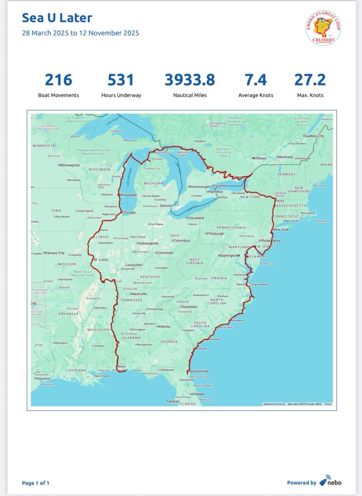 We come back mid January and will continue through the panhandle, down the west coast of Florida, to the keys, then back up to Jacksonville where we will cross our wake. We anticipate that to be end of March to mid April!