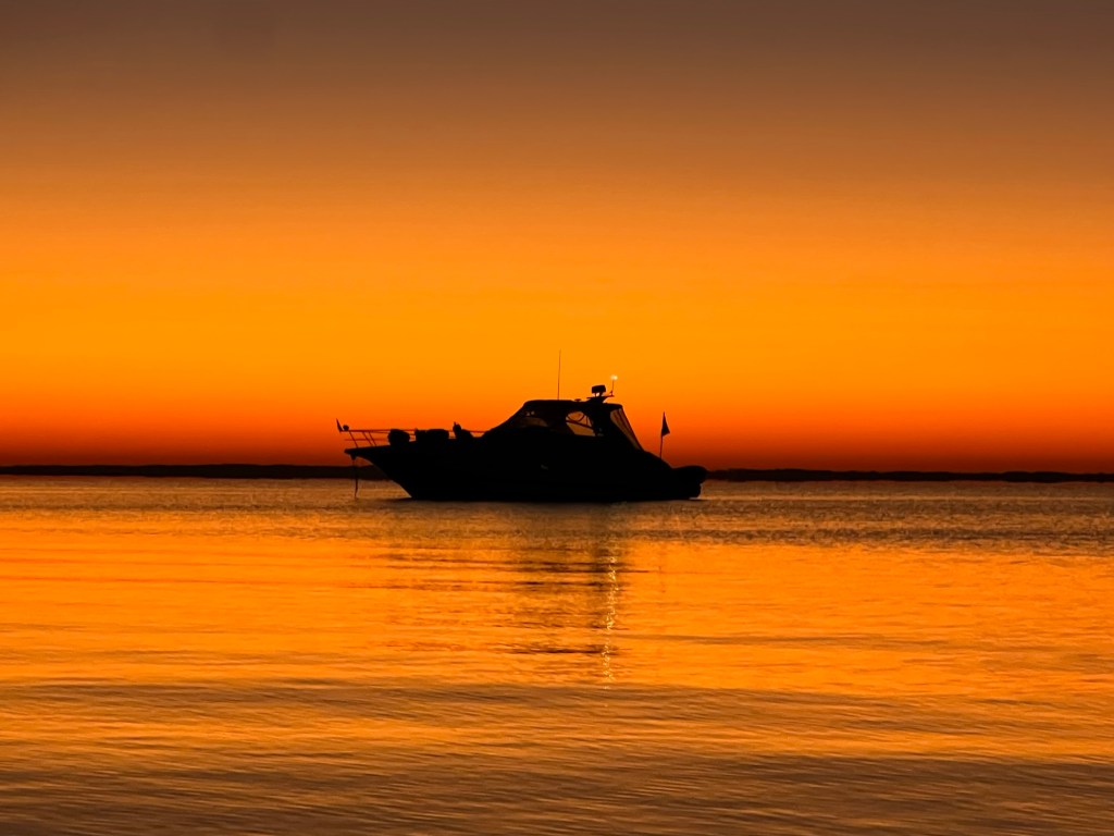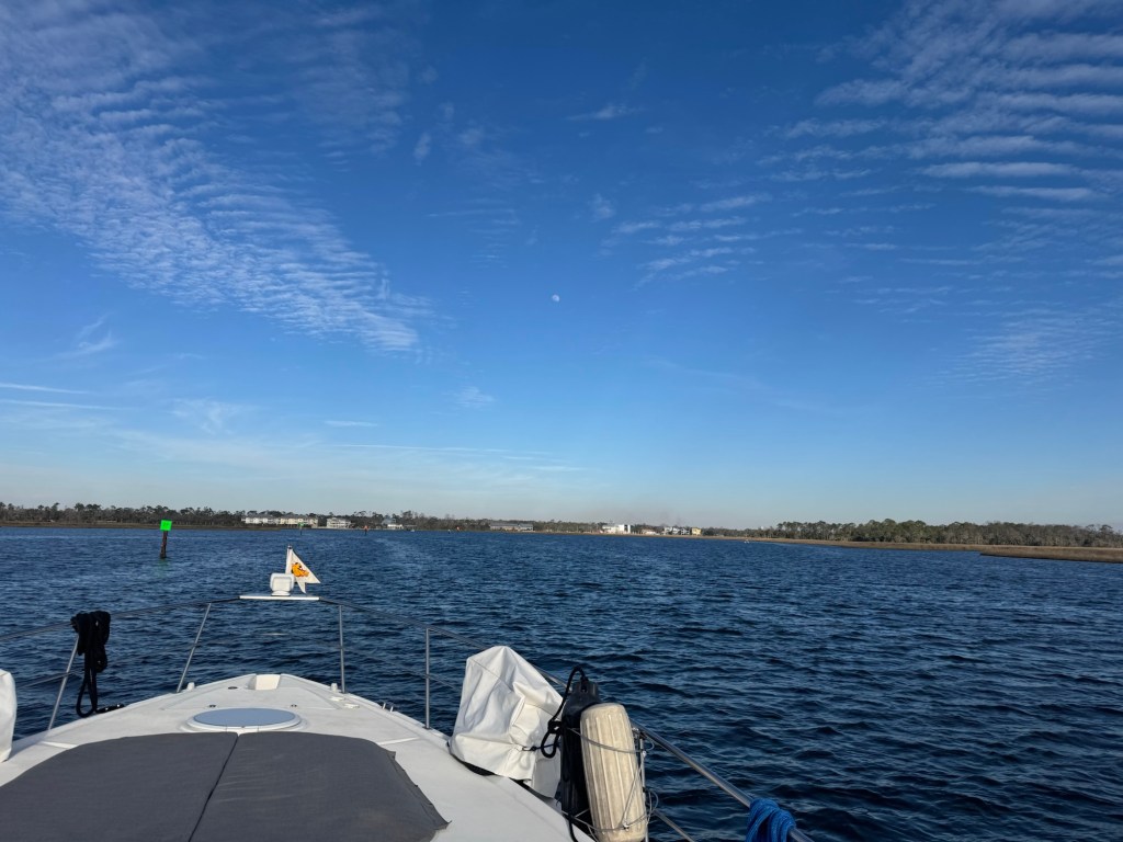 The anchorage (Carrabelle Beach), where we spent the night along with Winsor Rose was very rolling with waves until after midnight. As we tried to get some sleep, I immediately awoke when it became calm. It felt so wrong! Did we drift and go aground? Why are we not moving at all? I got up and looked out–looked at the anchor alarm and all was just fine. It was JUST THAT CALM! Slept like a baby the rest of the night. Morning came early and was chilly when we got up. We looked at multiple weather sources for wave and wind predictions, had a call with Winsor Rose and we all decided to give it a go. Winsor Rose took a great sunrise shot of our boat while they were on the beach walking their dog.