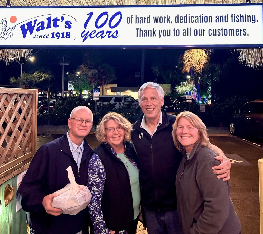 After arriving in Sarasota, our looper friends Bonnie and Louis from Goldilocks surprised us by stopping by with packages and joining us for dinner. It was so good to catch up. We headed to Walt’s Fish Camp—serving up seafood since 1918—and wow, it did not disappoint. I had the grouper… YUM! 😋