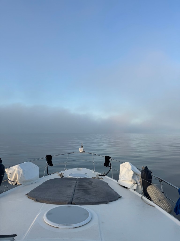 We were up early, ready to tackle the remaining 40+ miles to Marathon before the forecasted winds had their say. When we peeked outside, the water was glass — completely calm. Beautiful… but also a little suspicious. Because around here, calm often comes with a side of fog.