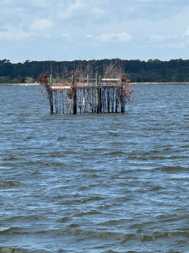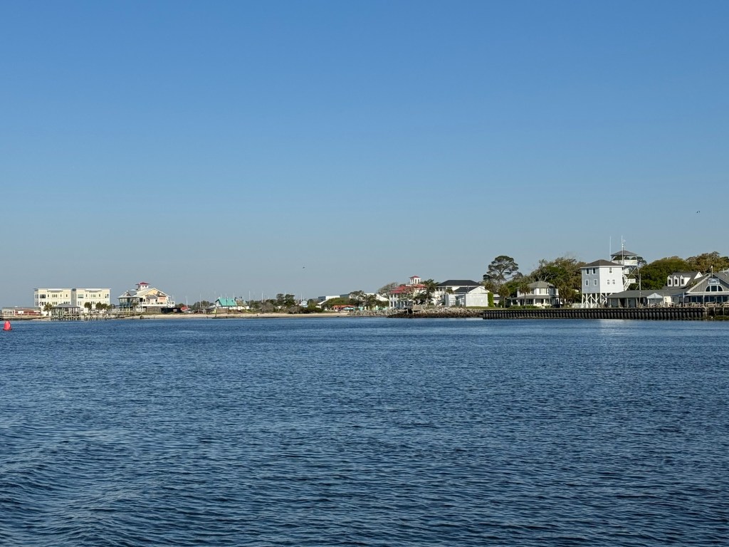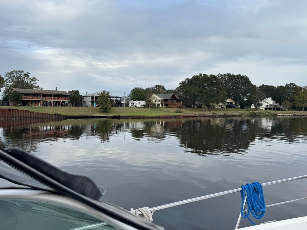 It’s so nice to see dolphins everyday again! We cruised slow today soaking in the scenery of the GICW (Gulf Intracoastal Waterway). Houses along here are mostly on stilts due to storm surge. We stopped at Lulu’s for lunch in Gulf Shores before heading to our anchorage for the next two days. Jeff and I worked on the next piece of isinglass which is very hard to sew on being 52x 82😳. The wind has already started to pick up and it will be blustery until Tuesday morning. We are tucked away in a very protected spot. They have freeze warnings down here! Brrrrr!